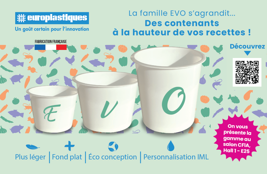 A l’occasion du salon de référence CFIA, l’entreprise Europlastiques agrandit la famille EVO ! EVO, c’est donc désormais une gamme de 3 pots ronds avec fond plat, éco-conçus, personnalisables par IML, operculables et conformes au règlement PPWR.